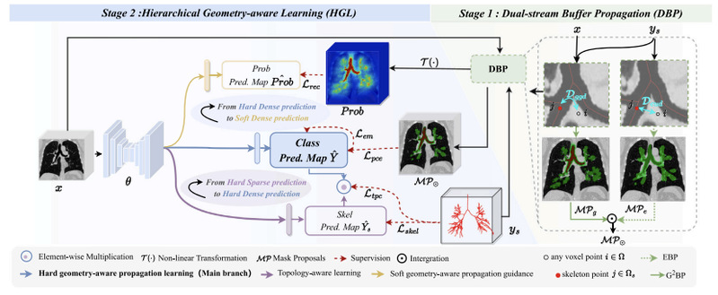 为应对上述挑战,该研究首次提出一种创新的骨架级标注(Skeleton Annotation, SKA)策略。该策略以基于控制点的逐分支标注模式,取代了传统的逐像素、逐切片的标注方法,将标注重点从像素级细节转移至保证气道树的拓扑完整性。然而,骨架级标注的极端稀疏性(标注体素占比低于3%)给深度学习模型的直接训练带来了困难。为此,团队进一步提出了名为Skeleton2Mask的稀疏监督学习算法。该算法通过一个创新的双流缓冲传播(Dual-stream Buffer Propagation)模块进行可靠的初始标签扩散,并利用分层几何感知学习(Hierarchical Geometry-aware Learning)框架,将稀疏的拓扑信息逐步、精确地传播为完整的体素级分割结果。