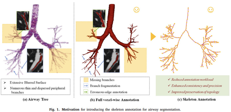 传统的精确气道分割严重依赖于体素级(voxel-wise)标注,该过程不仅耗时、耗力,且在处理复杂的气道树状结构时,常面临远端分支丢失、拓扑结构不完整及边缘界定模糊等挑战,限制了高质量训练数据的获取与先进分割算法的应用。